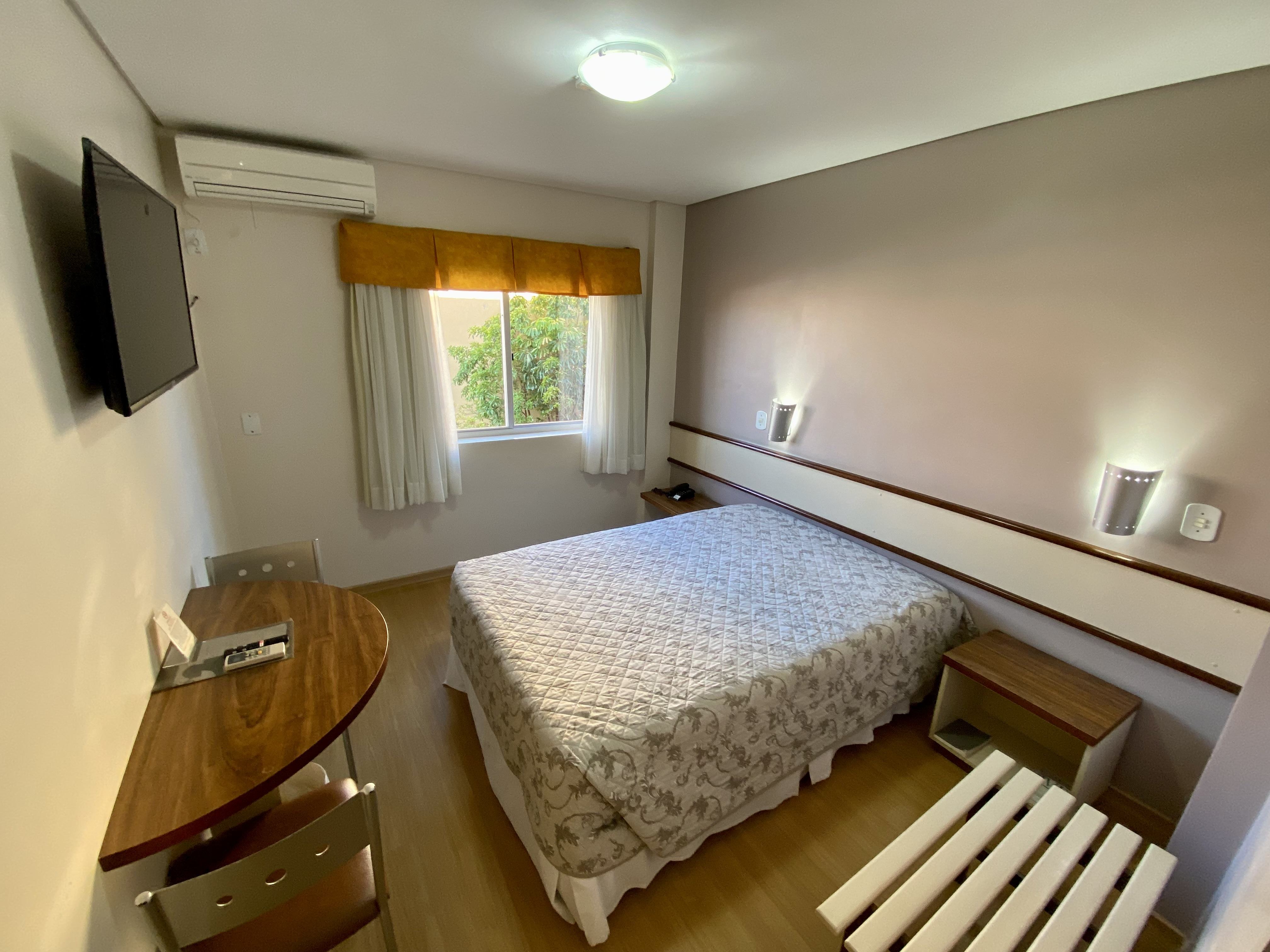 Quarto com 1 cama de casal, ar-condicionado, frigobar, TV, wi-fi e banheiro.