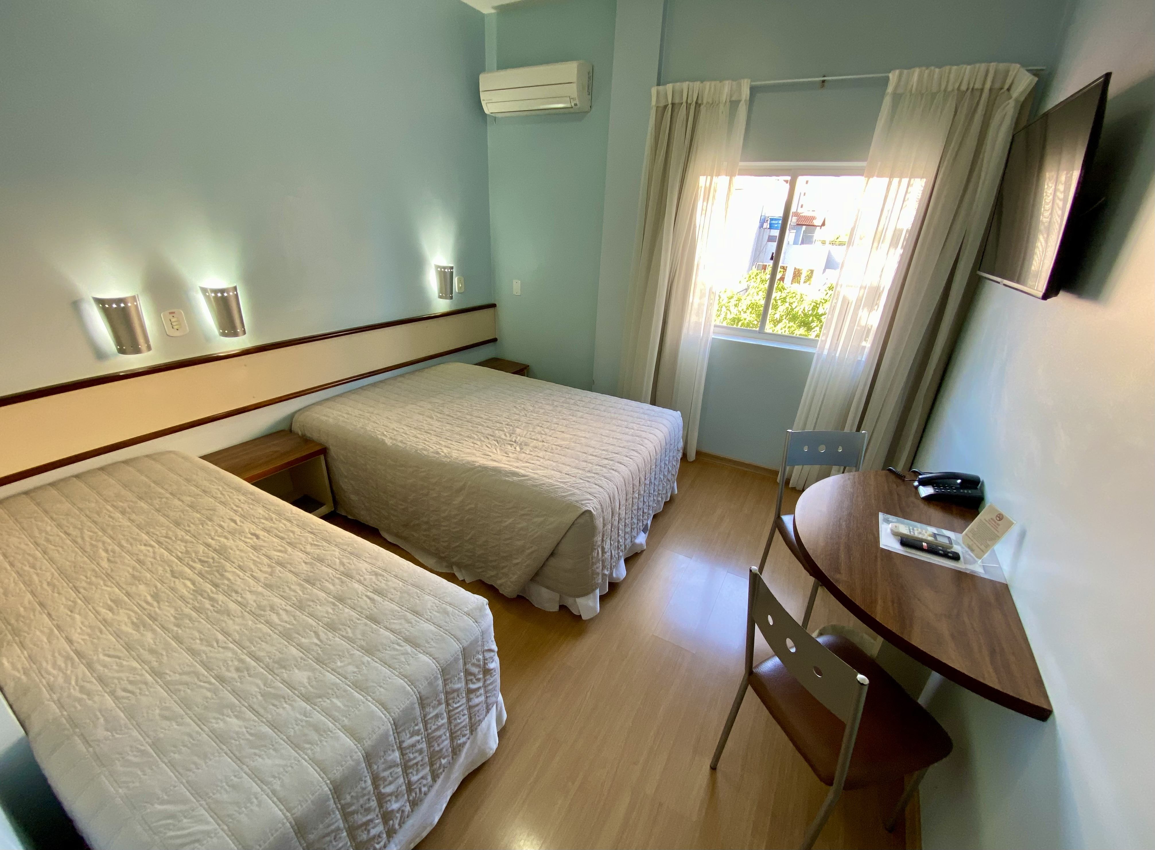Quarto com 2 camas de solteiro, ar-condicionado, frigobar, TV, wi-fi e banheiro.